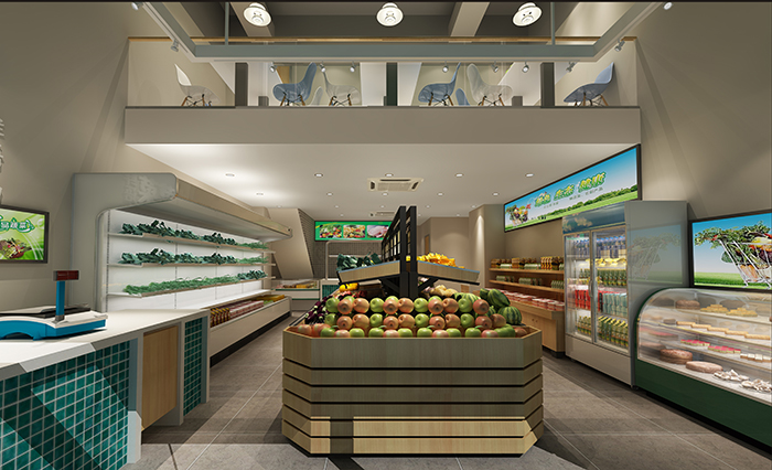 確定了品牌形象,我們開始啟動空間形象設計。菜菜公社的首家店位于西麗德意名居,這個小區靠近地鐵7號線西麗湖站,小區入住率非常高,消費人群比較高端。菜菜公社的定位是高品質生鮮,我們的空間形象核心就是在滿足生鮮店各項功能基礎上,塑造高品質,互動體驗的特色。