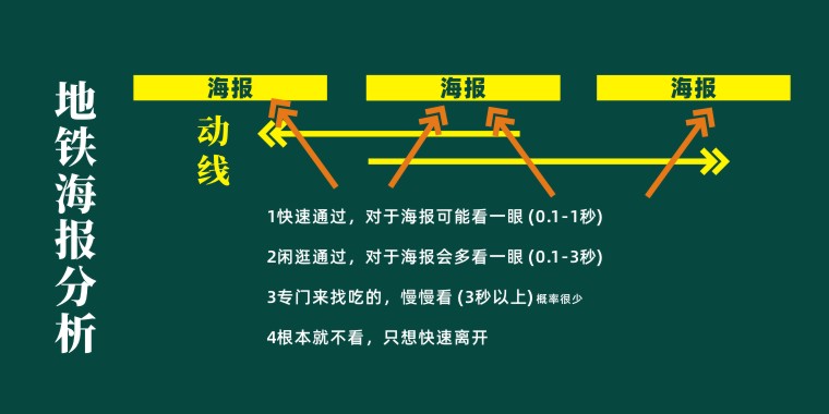 通過在地鐵站現(xiàn)場觀察,品深發(fā)現(xiàn)蘩樓的地鐵海報位置單面靠墻,閱讀動線是沿著墻的路徑左右行走,目標(biāo)是向前方換乘或出站,由于客流密集,路過此處的人完全無法停下來,看到海報的大部分的機(jī)會是眼睛的余光一掃而過,邊走邊看。
