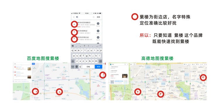 蘩樓”這個詞在搜索端屬于新詞,且由于都是臨街店鋪,只要在導(dǎo)航地圖上搜索“蘩樓”即可出現(xiàn)店面的準(zhǔn)確地址,因此在海報地址信息中只需要告訴顧客店址區(qū)域即可,如:“華強(qiáng)北店”顧客自動腦補(bǔ)深圳華強(qiáng)北區(qū)域蘩樓,加上智能手機(jī)強(qiáng)大的導(dǎo)航功能,只需要搜索“蘩樓”選取“華強(qiáng)北”為主的關(guān)鍵詞即可知道離店的大概距離。