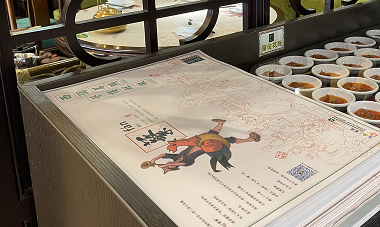 此次海報設(shè)計有六個連續(xù)畫面,正好適合推廣明星款產(chǎn)品。因蘩樓的產(chǎn)品本身就有較強(qiáng)的藝術(shù)美感及傳頌效果,綜合店長及蘩樓主廚師建議,我們選取了6款產(chǎn)品來作為本次海報主題畫面,每一款海報主推一款明星產(chǎn)品,以連續(xù)陣列式畫面排開,顧客路過通過6個重復(fù)品牌畫面+強(qiáng)調(diào)明星產(chǎn)品的形式,視覺震撼,很容易形成對蘩樓的品牌記憶。