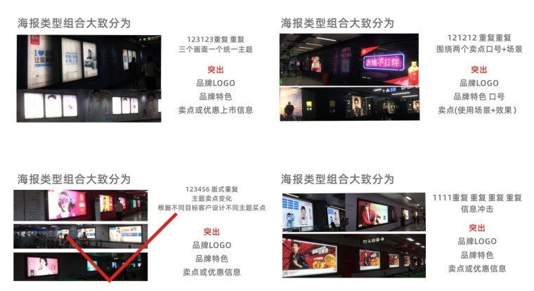 我們選取了(周末時間+上班時間)兩天,對深圳客流密集的多個地鐵中轉(zhuǎn)站點,和幾個特定時間段。進(jìn)行現(xiàn)場蹲點觀察,并拍攝了目前1000多張地鐵站現(xiàn)存的海報圖片實例。通過對海報圖片的分類整理,地鐵站客流對廣告關(guān)注度點的觀察。最終團(tuán)隊投票選取出印象最深且能傳達(dá)品牌信息的多張地鐵站品牌海報進(jìn)行廣告?zhèn)鞑ピ砑霸O(shè)計原理逆向推理分析: