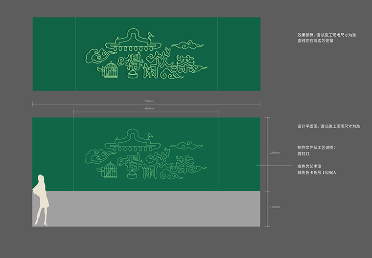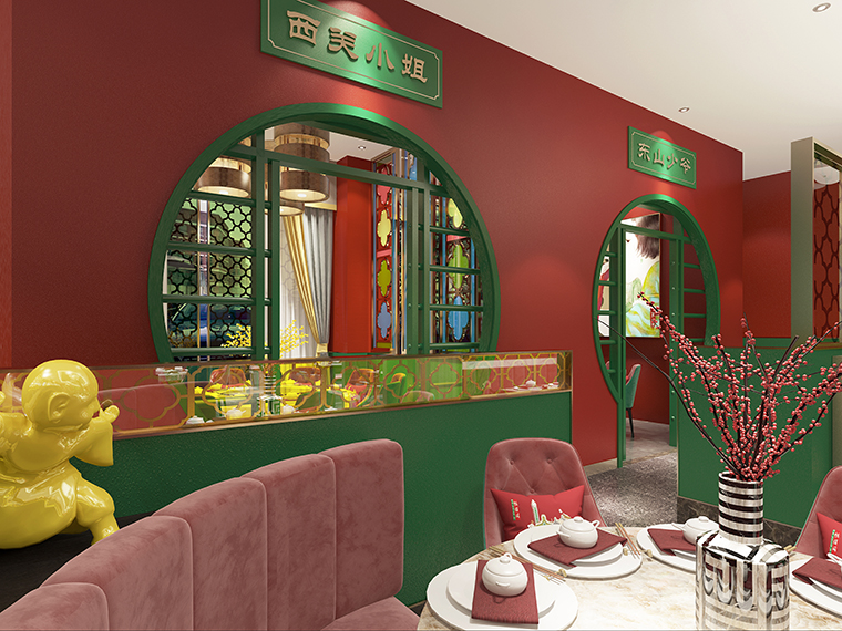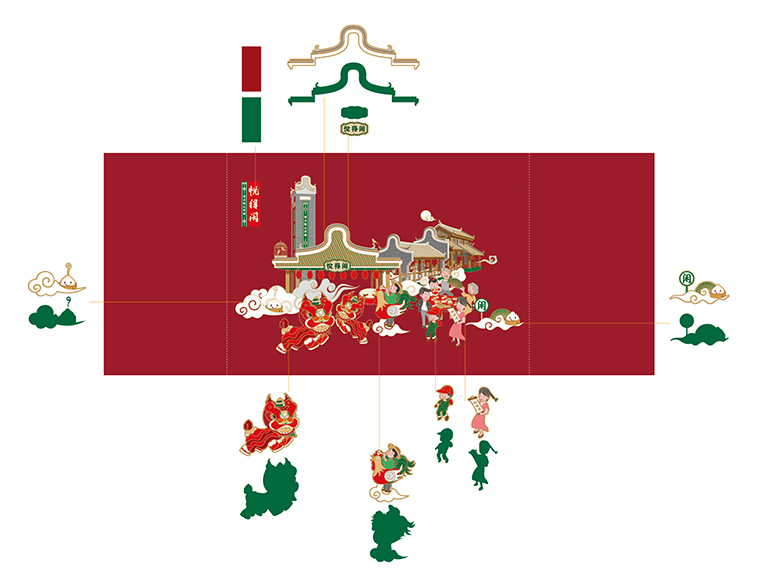 大面積紅色配深綠色,用色非常大膽,寓意大紅配大綠,富貴吉祥又添財氣。既有濃重的地域特色,又有鮮明的品牌識別度,創(chuàng)造了廣式茶樓形象設(shè)計的新突破。