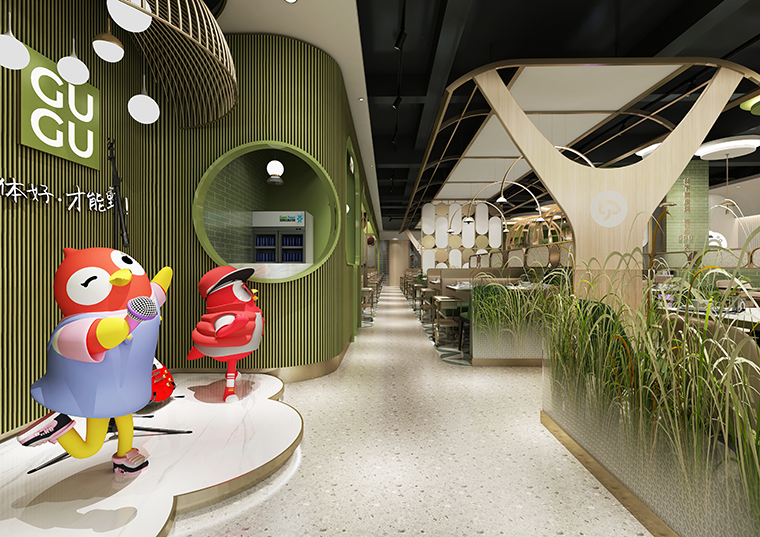 為了營(yíng)造自然,清新,通透的空間感受,體現(xiàn)咕咕豬肚雞清湯養(yǎng)生特點(diǎn),品深餐飲裝飾設(shè)計(jì)團(tuán)隊(duì)使用了淺木色半包鳥籠造型,隔斷中遍種仿真綠植,墻面以淺白色手工磚突出了發(fā)光不銹鋼廣告畫面的內(nèi)容,簡(jiǎn)約又具有鮮明的廣告效果,很好地將咕咕豬肚雞的品牌文化、品牌形象及品牌內(nèi)容在空間中展現(xiàn)出來(lái)了。