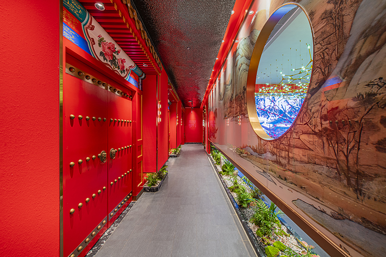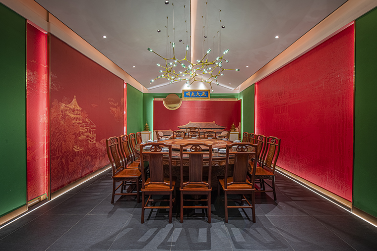 1、本項目為京味張東莞大朗碧桂園里悅里店,總面積約829平方米。用中國紅強化品牌內含的北京皇城文化,令人印象鮮明;